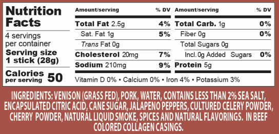 Delicious and lean, we added spicy Jalapenos to our signature venison snack sticks 4 pack. Hickory smoked, these low-fat, low-carb, high-protein snack sticks are likely to be one of the healthiest things you’ll eat all week. So... what are you going to do with 4 sticks of wonderful.. share 'em or keep them all to yourself?